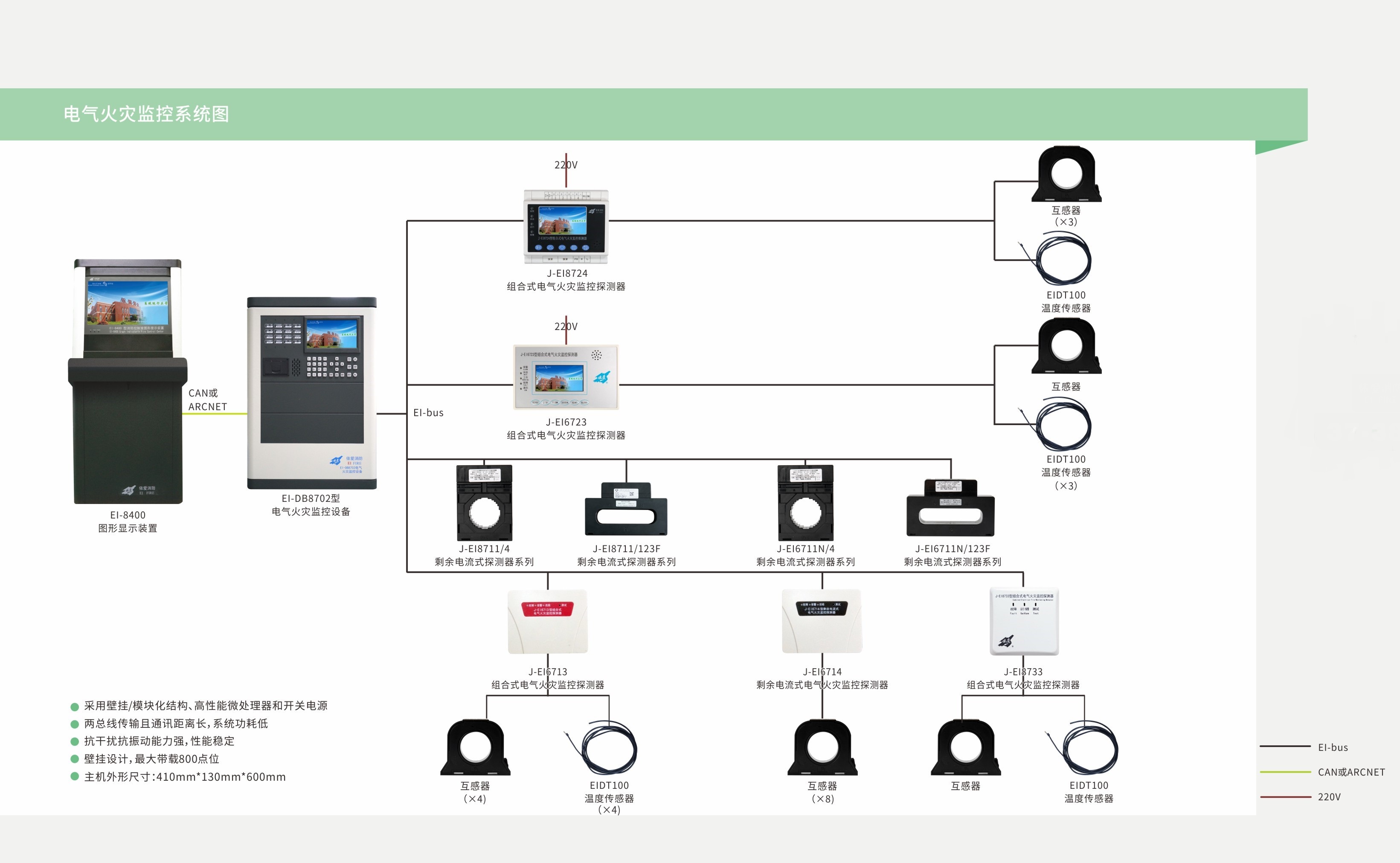 EI 系列電氣火災監控系統應包括電氣火災監控設備、剩余電流探測器(電流互感器)、測溫式探測器(傳感器)等產(chǎn)品。