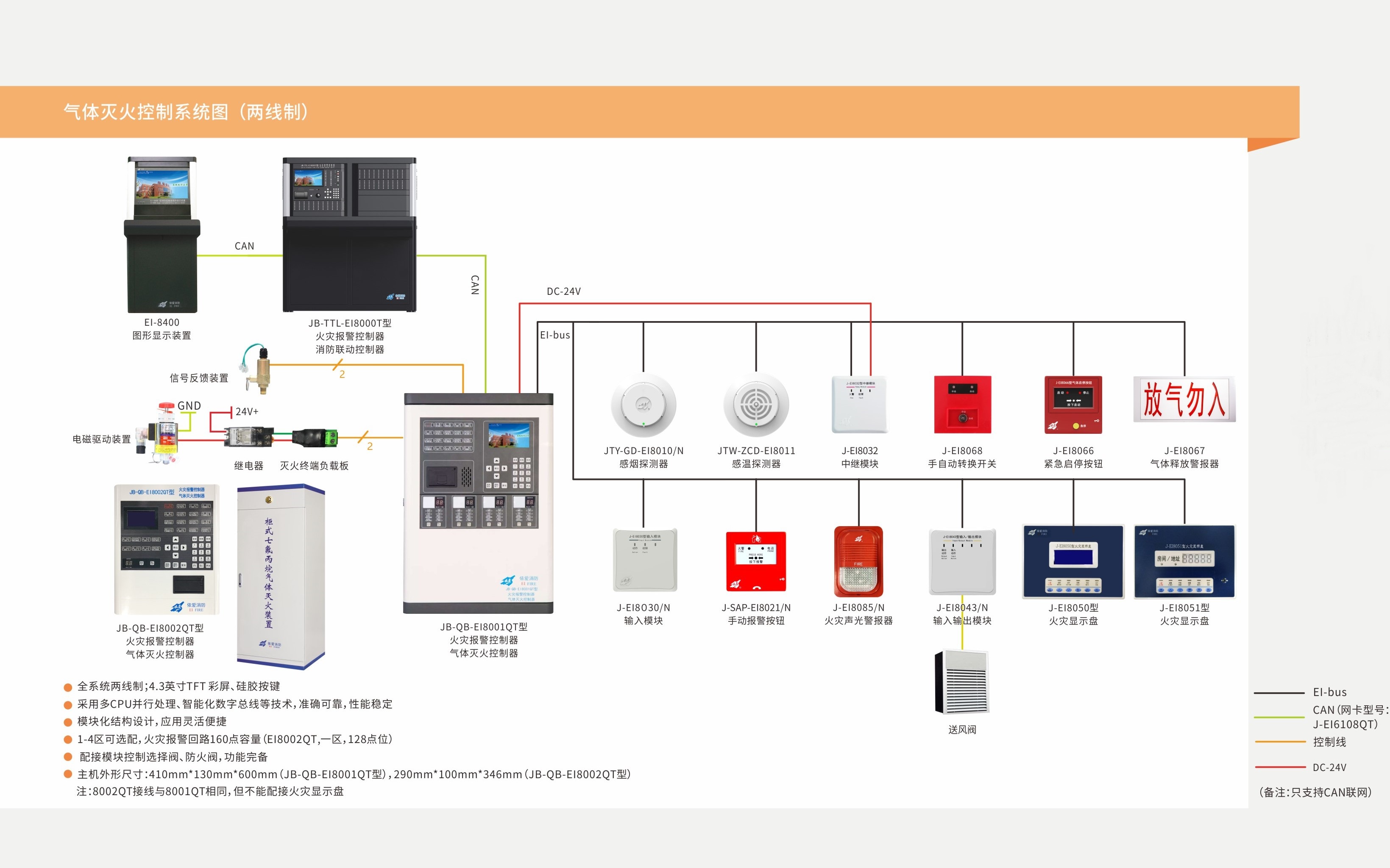 JB-QB-EIN70 系列氣體滅火控制系統包括氣體滅火控制器、緊急啟/停按鈕、放氣指示燈、聲光報警器、手/自動(dòng)轉換開(kāi)關(guān)等產(chǎn)品,集火災報警、氣體滅火功能于一體,滿(mǎn)足 GB4717、GB16086 的要求,控制器內置氣體滅火區控模塊,可分別控制各區氣體滅火設備,顯示工作狀態(tài),工作可靠,性能穩定,使用方便,可廣泛用于各類(lèi)氣體滅火工程。